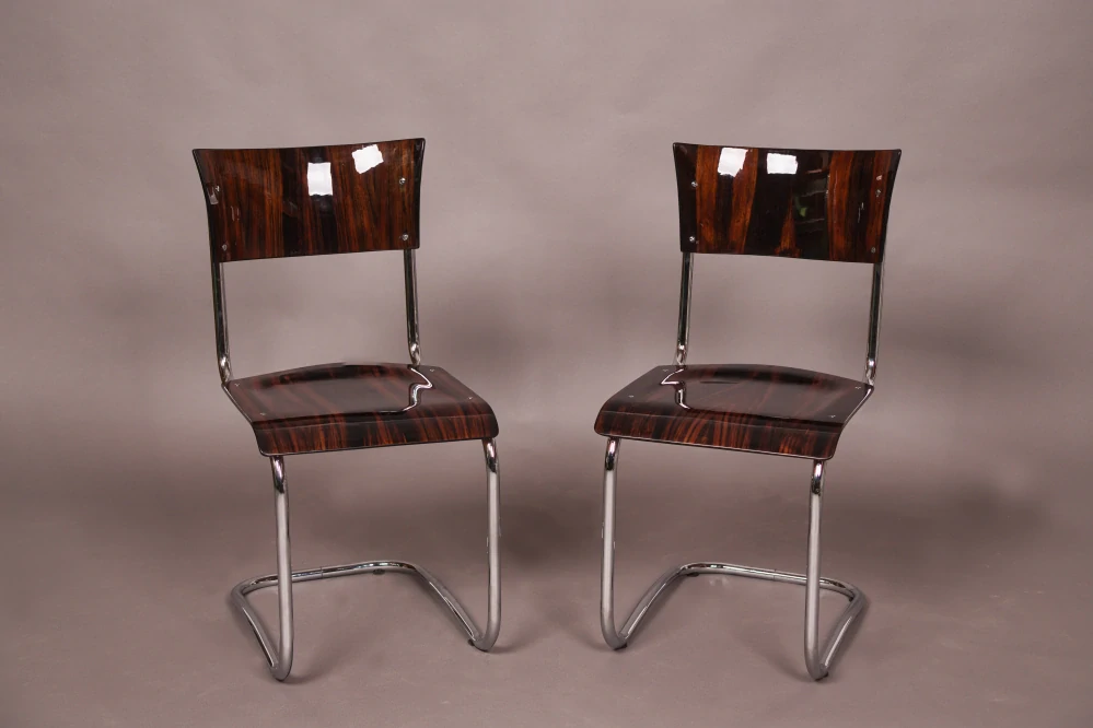 Odborně restaurovaný originál ikonické židle S10, vyráběné firmou Robert Slezák, Bystřice pod Hostýnem ve 30.–40. letech 20. století. Návrh pochází od Martina Adriaana Stama (1899–1986) a byl později upraven Marcelem Breuerem (1902–1981). Jde o typický příklad funkcionalistického nábytku ve stylu Bauhaus.